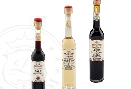 莱昂纳迪众多的产品中包括:指定产区DOP摩迪纳传统香醋,限定产区IGP摩迪纳传统香醋,香醋调料,白香醋,沙巴(烹过的葡萄汁),